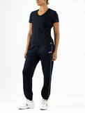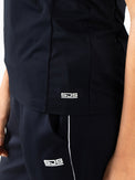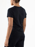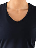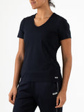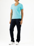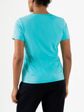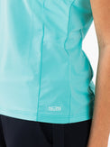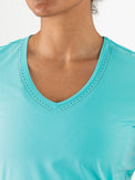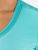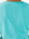 Schönes und luftiges Damen-T-Shirt, ideal für Sommertage. Dieses Single-Jersey-Shirt in Arubablau und Dunkelblau hat einen V-Ausschnitt und Perforationen, unter anderem im oberen Rückenbereich. Dadurch wird eine optimale Belüftung beim Sport gewährleistet.