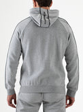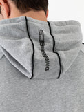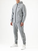 Hooded men's track jacket made of brushed jersey in college grey melange. The jacket features two slit pockets at the front and an additional pocket with a sealed zipper. The sleeves are trimmed with contrasting piping, and one sleeve features a print of the Sjeng Sports High Performance logo.