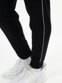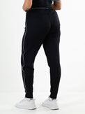 Opt for comfort with these soft, dark blue, plus-size women's trousers, made of foamy interlock fabric. They feature a handy zippered pocket at the back. Pintuck seams and contrasting piping add a stylish twist to this sporty essential.