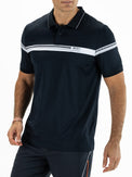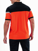 Men's polo shirt made of ultralight ripstop fabric in bright tangerine with a dark blue top. Horizontal single jersey inserts with silicone prints run across the body and sleeves. Contrasting stripes run along the collar and cuffs.
