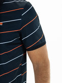 Stylish men's polo shirt in dark blue single jersey printed with diagonal stripes in contrasting colors. The cuffs and collar are knitted in textured knit. This polo shirt is perfect for the tennis court but also fits well into your everyday wardrobe.