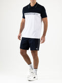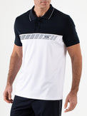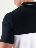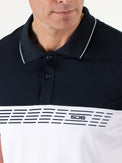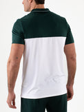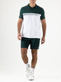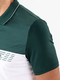Sporty men's single-jersey polo shirt in dark blue and retro green with a partially white front panel. Contrasting stripes run along the white panel, and the "Sjeng Sports" logo is printed on the chest. Contrasting stripes also run along the collar of this polo shirt.