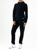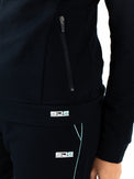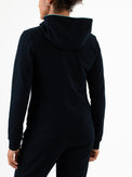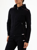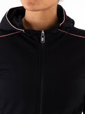Sporty women's hoodie in black with contrasting piping along the hood and shoulders. The pocket zippers are also in a contrasting color. This hooded jacket is made of French terry, a lightweight sweat fabric without a fleece lining.