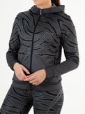 This stylish women's power stretch hoodie in trendy pink glo combines comfort with a sporty look. The body and sleeves feature a striking tiger print. The printed piping along the waist and sleeves creates a dynamic look.